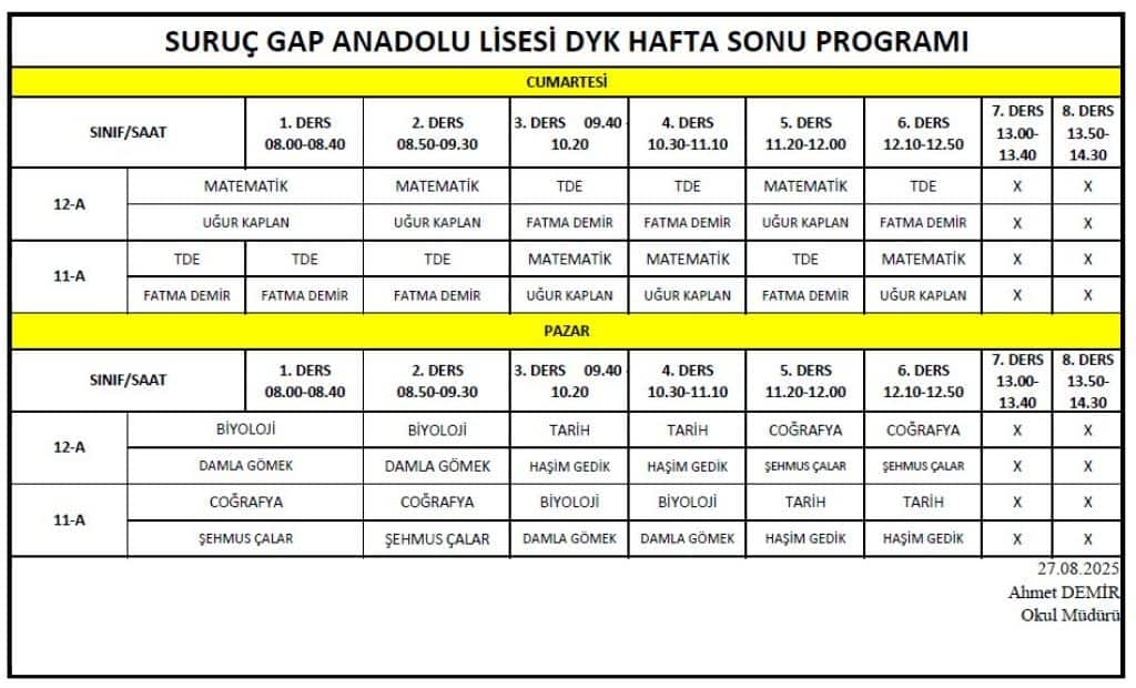 Suruç GAP Anadolu Lisesinde Destekleme ve Yetiştirme Kursları (DYK) haftalık programı uygulanmaya başlamıştır