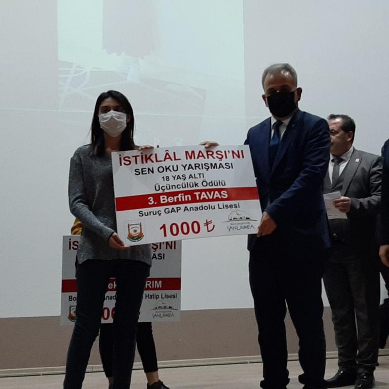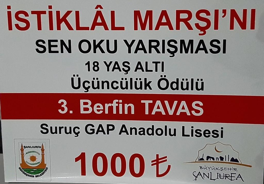 Şanlıurfa Büyükşehir Belediyesi tarafından düzenlenen ''İstiklal Marşını Sen Oku" yarışmasında, yaklaşık 2 bin kişinin arasından Okulumuzun 11/D Sınıfı Öğrencisi Berfin TAVAS, dereceye girerek üçüncü olmuştur.