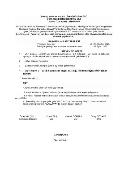 Suruç GAP Anadolu Lisesi erkek öğrenci pansiyonunda 2025–2026 eğitim öğretim yılında barınmak isteyen öğrenciler için pansiyon kayıt başvuruları başlamıştır.